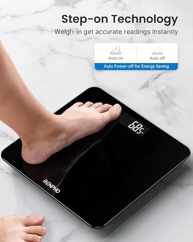 - Step-on technology – The self-calibrated bathroom scale achieves precise and immediate weighing readings, equipped with step-on technology, auto on/off function and low battery indicator.